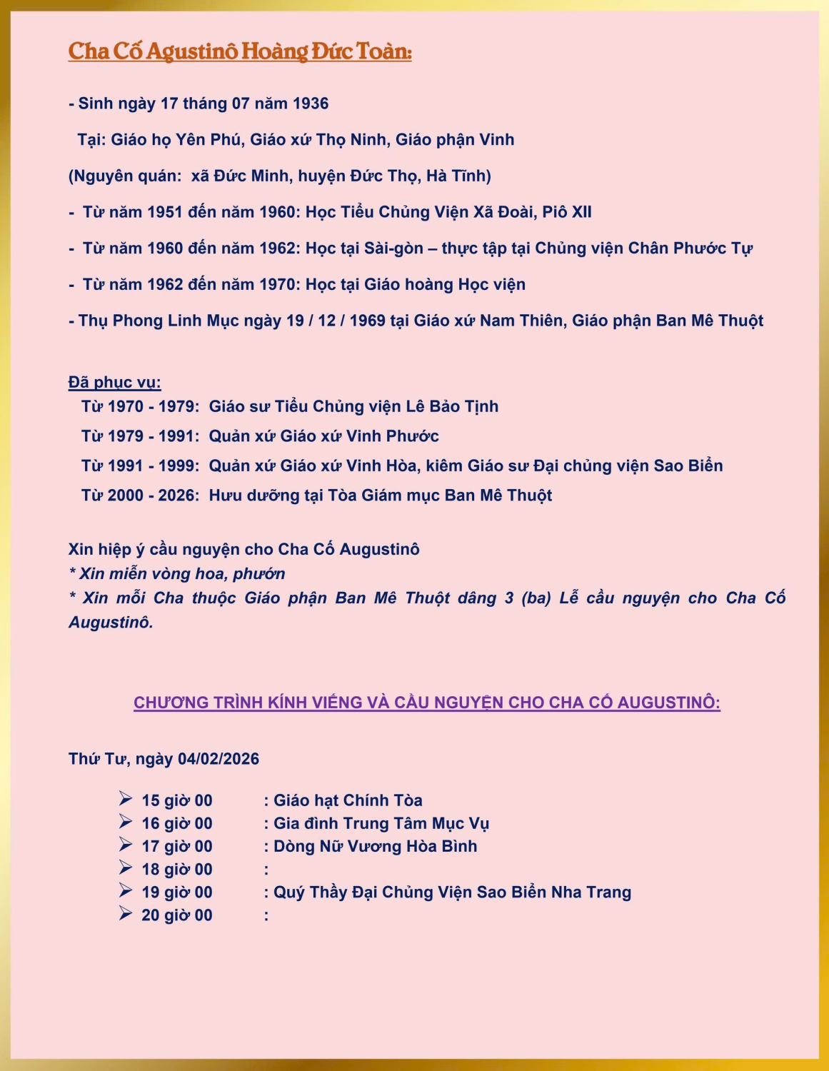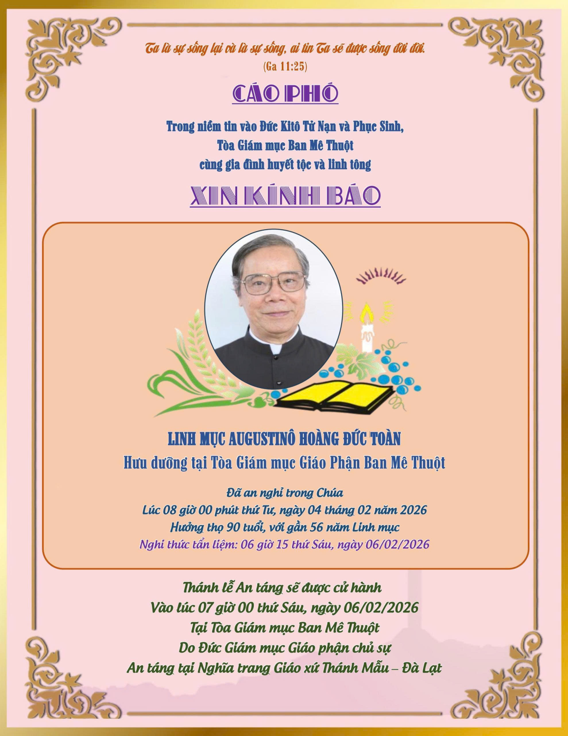 LINH MỤC AUGUSTINÔ HOÀNG ĐỨC TOÀN Đã an nghỉ trong Chúa lúc 08 giờ 00 thứ Tư, ngày 04 tháng 02 năm 2026