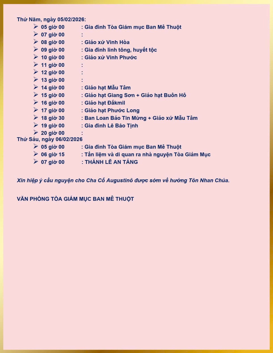 * Xin mỗi Cha thuộc Giáo phận Ban Mê Thuột dâng 3 (ba) Lễ cầu nguyện cho Cha Cố Augustinô.