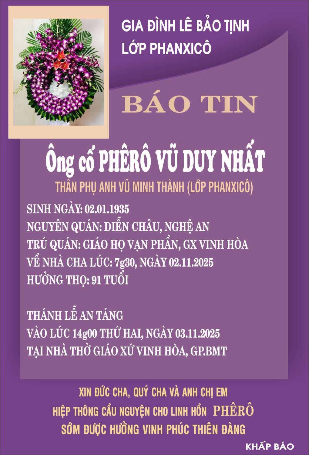 Gia đình Lê Bảo Tịnh xin chia buồn cùng Gia đình anh Vũ Minh Thành, Cha Phêrô Vũ Minh Tuyền (RIP), soeur Têrêsa Vũ Thị Thanh Thùy và tang quyến.