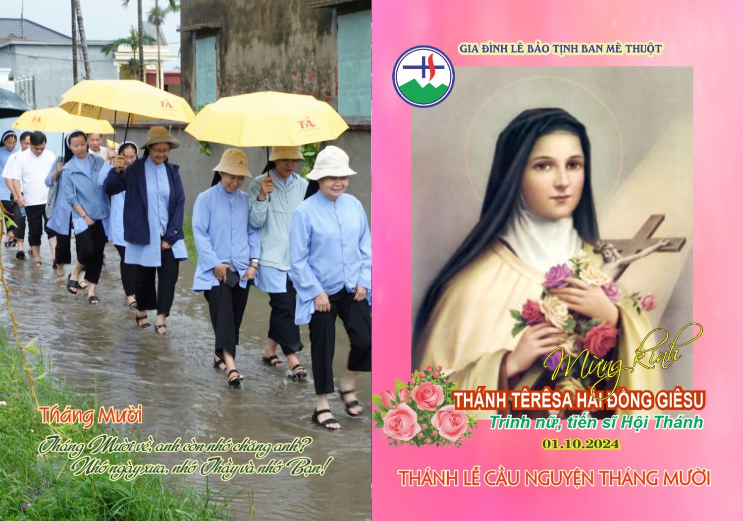 Trong tháng này, chúng con trân trọng kính mời Quý Đức Cha, Quý Cha và Anh Chị Em cùng hiệp thông tham dự Thánh lễ vào lúc 5g30 sáng thứ Ba ngày 01.10.2024 tại Nhà nguyện Trung tâm Mục vụ (số 01 Trần Hưng Đạo, TP.BMT), cầu nguyện theo tâm tình tháng Mười: