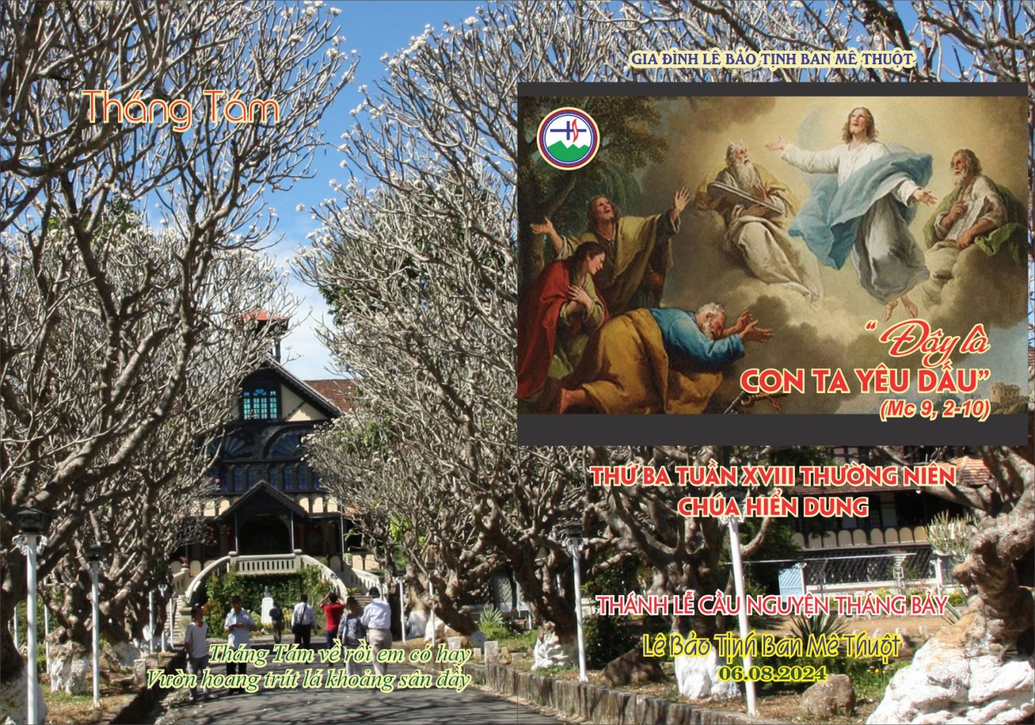 Chúng con trân trọng kính mời Quý Đức Cha, Quý Cha và Anh Chị Em cùng hiệp thông tham dự Thánh lễ vào lúc 5g30 sáng thứ Ba ngày 06.8.2024 tại nhà nguyện Trung tâm Mục vụ (số 01 Trần Hưng Đạo, TP.BMT) cầu nguyện theo tâm tình tháng Tám: